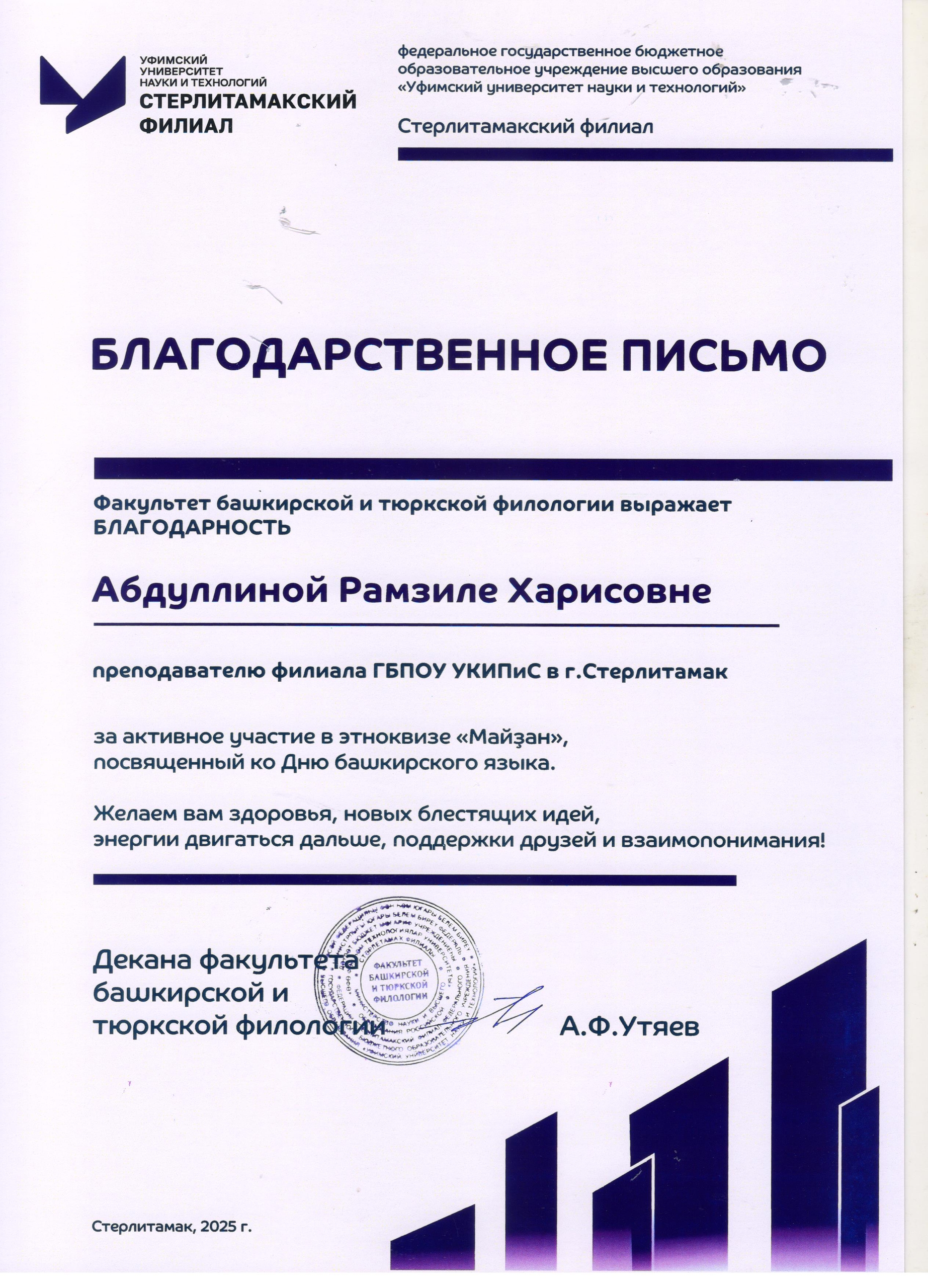 Преподаватель филиала УКИПиС в г.Стерлитамак Абдуллина Рамзиля Харисовна получила благодарственное письмо от Стерлитамакского филиала Уфимского университета науки и технологий! Это высокая оценка её активного участия в этноквизе «Майҙан», посвящённом Дню башкирского языка. Гордимся и поздравляем! Так держать!