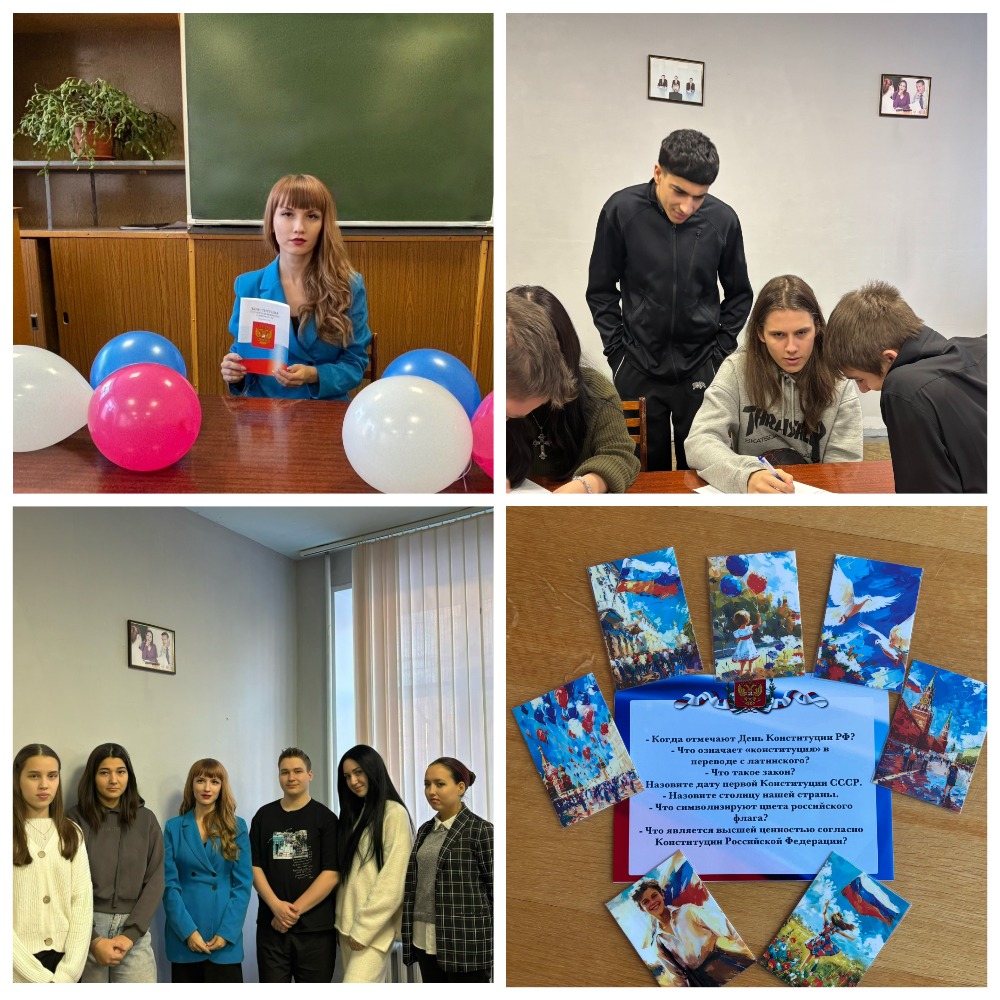 Уже скоро наша страна будет отмечать важную дату. День Конституции Российской Федерации, отмечается ежегодно 12 декабря, — это одна из значимых памятных дат российского государства. Конституция — главный нормативный правовой акт России, база для текущего законодательства. Накануне этого важного дня, в Стерлитамакском филиале Уфимского колледжа индустрии питания и сервиса состоялось групповое занятие: «День конституции». Студенты колледжа приняли участие в интеллектуальной викторине: «Знаток Конституции РФ», а так же поговорили о том за, что они любят свою страну. Уверены, что для студентов это не только слова, но и правильный вектор их дальнейшего развития, в котором важное место занимает патриотизм и любовь к своей Родине