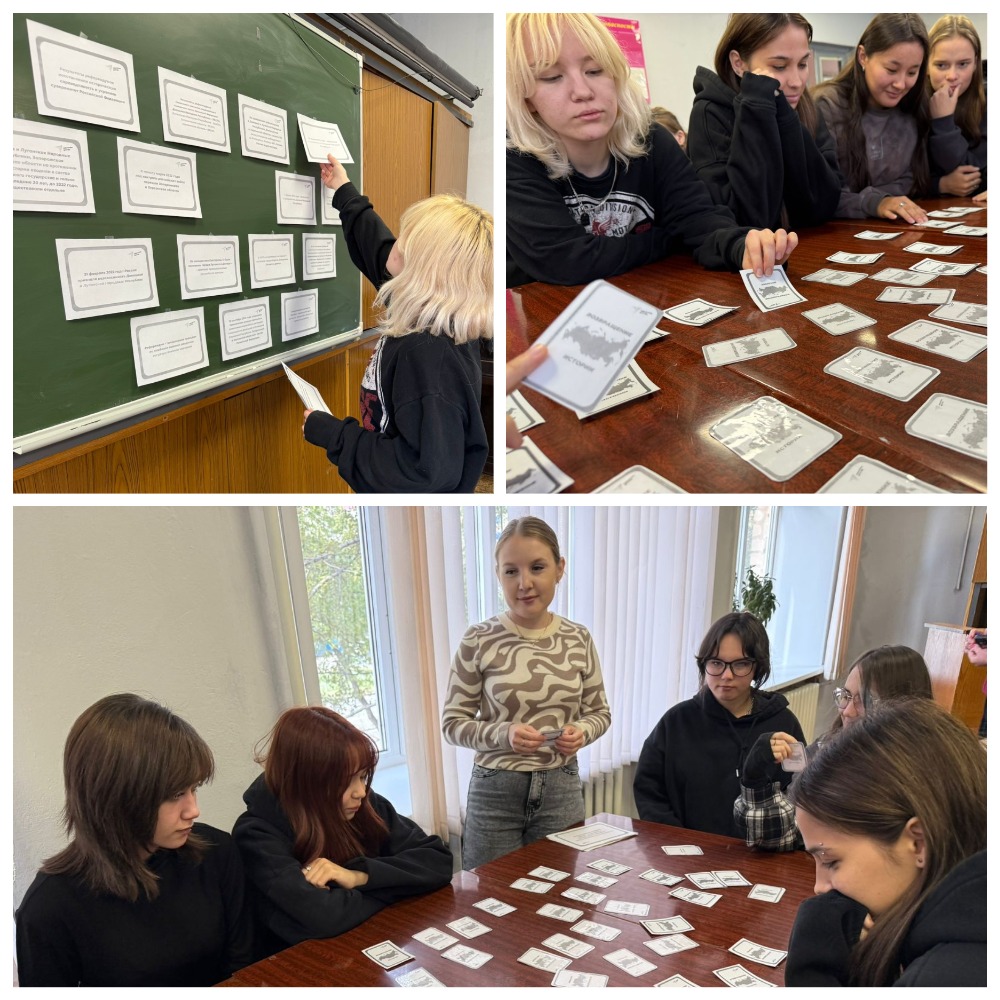 Советник директора по воспитанию Марина Алексеева провела настольную игру «Возвращение истории» для студентов третьего курса, целью которой является актуализация знаний по историческим событиям ДНР и ЛНР, Запорожской области и Херсонской области.