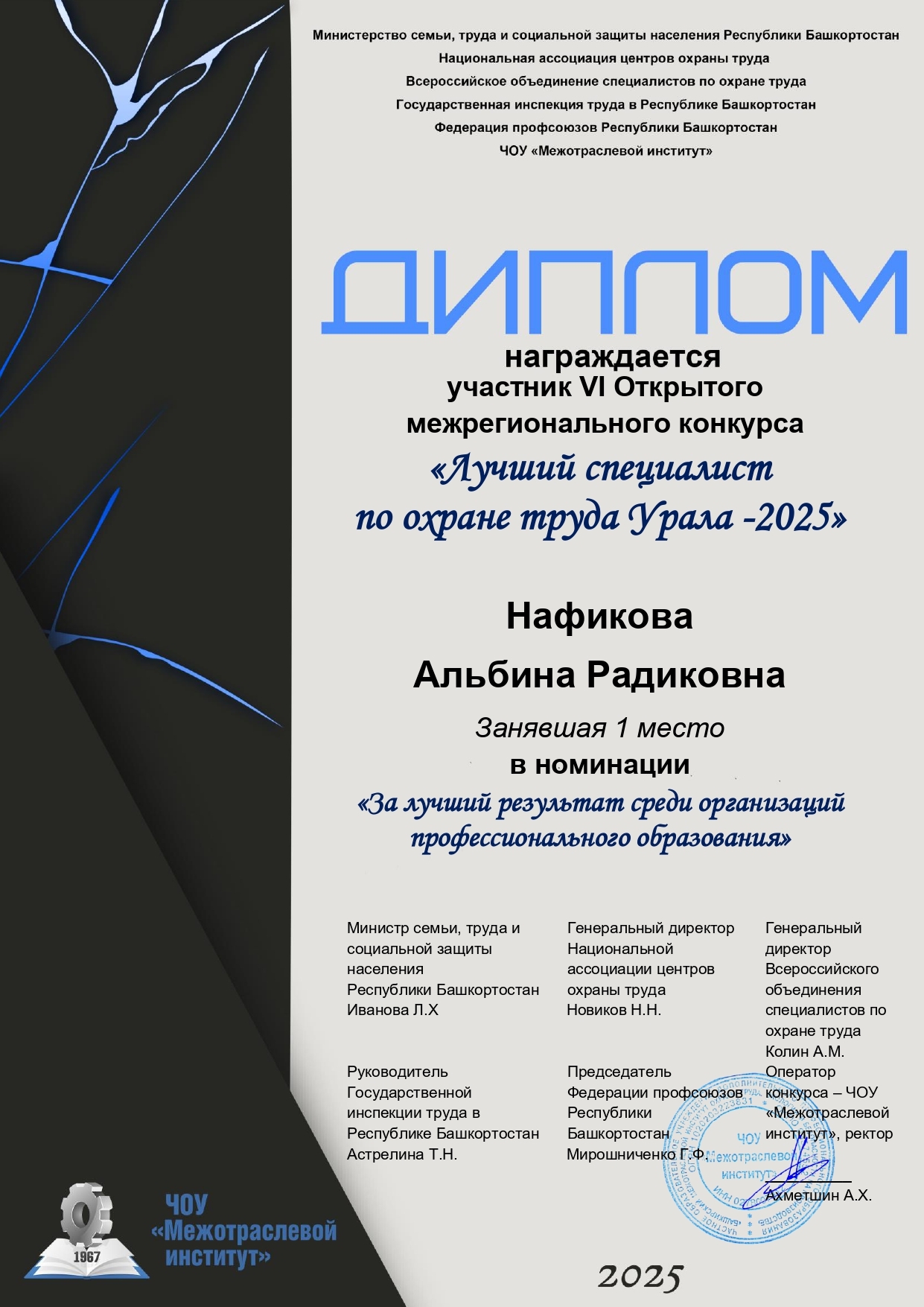 27 ноября 2025 года в Башкирском межотраслевом институте состоялся VI Открытый Межрегиональный конкурс «Лучший специалист по охране труда Урала – 2025». Свои знания и опыт продемонстрировали 1108 человек из различных регионов. Были определены лучшие специалисты в номинациях по отраслям экономики в соответствии с кодами ОКВЭД. Организаторы конкурса стали: Национальная ассоциация центров охраны труда; Министерство семьи, труда и соцзащиты РБ, Всероссийское объединение специалистов по охране труда, Государственная инспекция труда в РБ, Федерация профсоюзов РБ, ЧОУ «Межотраслевой институт».