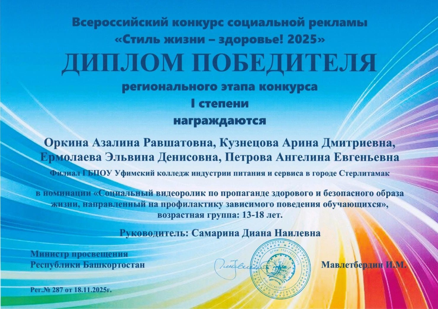 Медиа центр Стерлитамакского филиала Уфимского колледжа индустрии питания и сервиса стал победителем 1 степени Регионального этапа Всероссийского конкурса социальной рекламы "Стиль жизни - здоровье! 2025". Поздравляем ребят, а также руководителя Самарину Диану Наилевну.