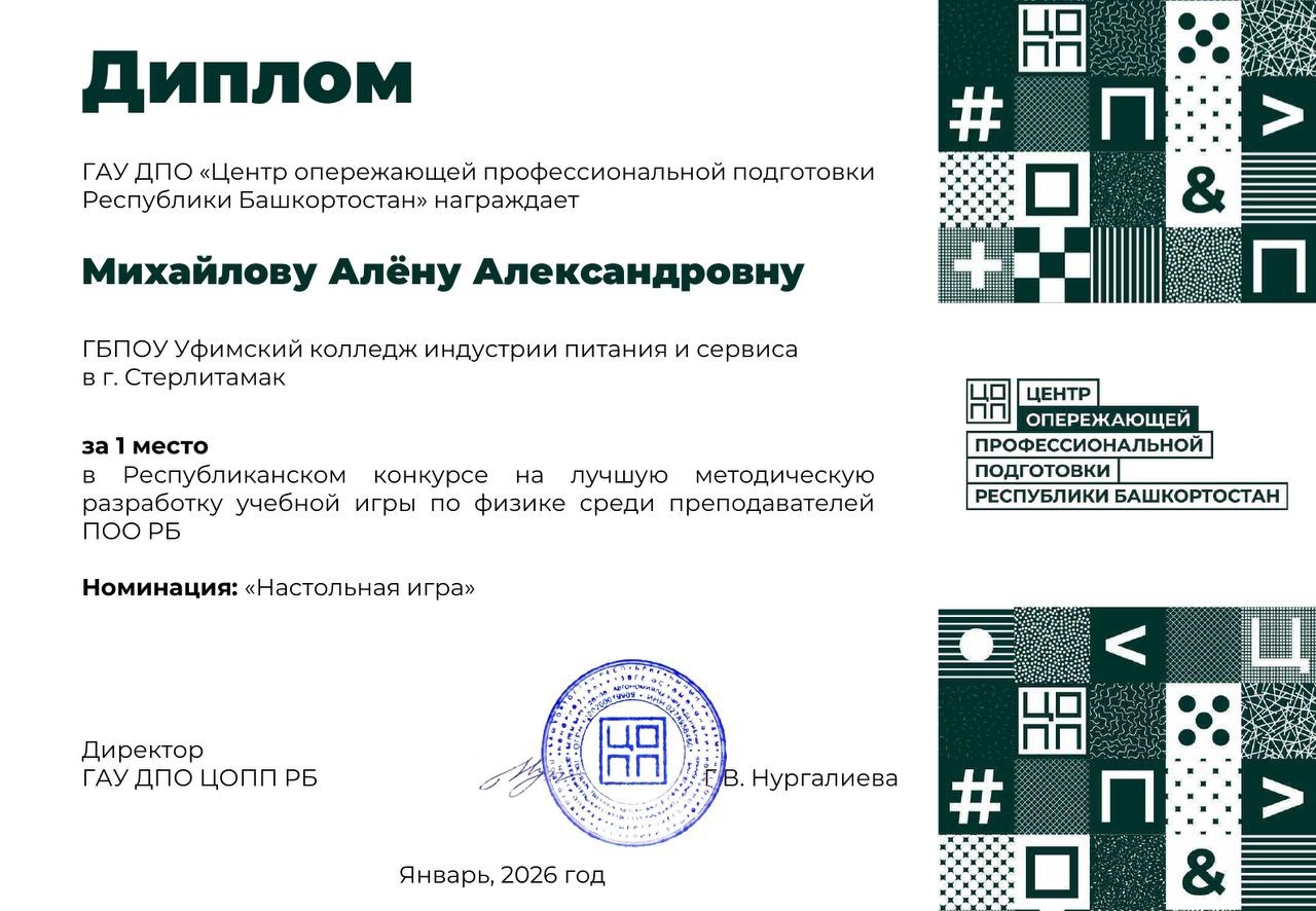 С 1 декабря 2025г. по 20 января 2026г. проходил Республиканский конкурс на лучшую методическую разработку учебной игры по физике среди преподавателей профессиональных образовательных организаций Республики Башкортостан, организованный ГАУ ДПО ЦОПП РБ. В данном конкурсе приняла участие преподаватель физики Стерлитамакского филиала Уфимского колледжа индустрии питания и сервиса Михайлова А.А. и заняла почетное 1 место. Поздравляем Алёну Александровну и желаем дальнейших успехов и побед!