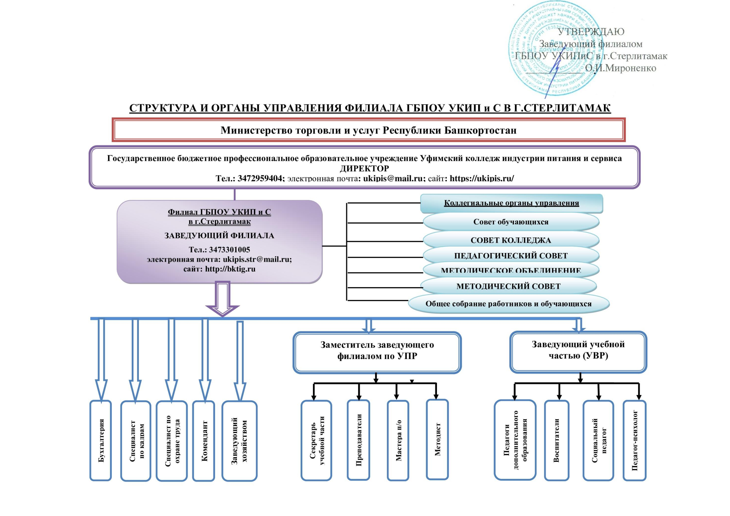 Непосредственное руководство осуществляет заведующий филиалом Мироненко Ольга Ивановна, тел. 8 (3473) 30-10-05, e-mail: ukipis.str@mail.ru