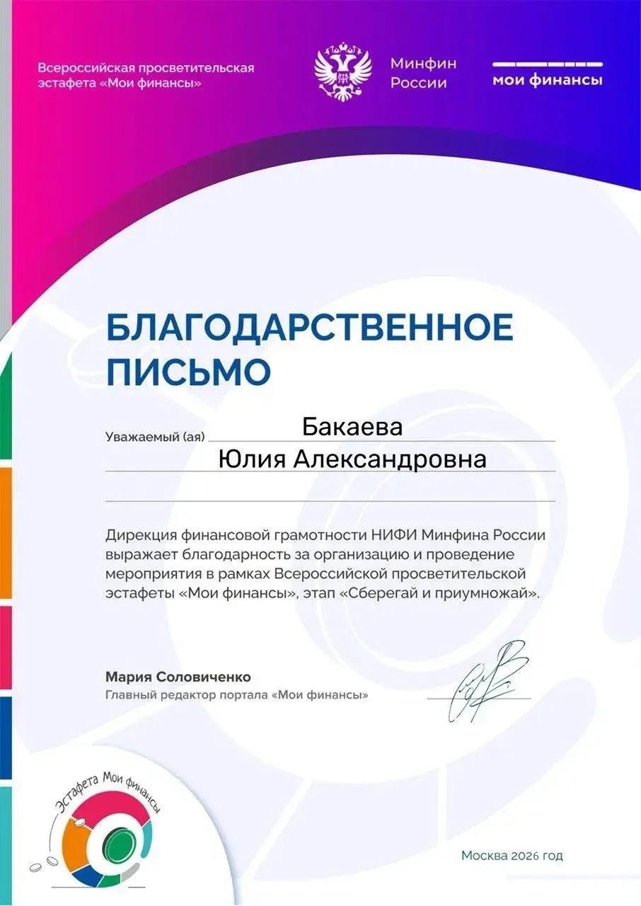 Преподавателю Стерлитамакского филиала Уфимского колледжа индустрии питания и сервиса Бакаевой Юлии Александровне объявлена благодарность Дирекции финансовой грамотности НИФИ Минфина России за организацию и проведение мероприятия в рамках Всероссийской просветительской эстафеты "Мои финансы", этап "Сберегай и приумножай". Поздравляем Юлию Александровну!