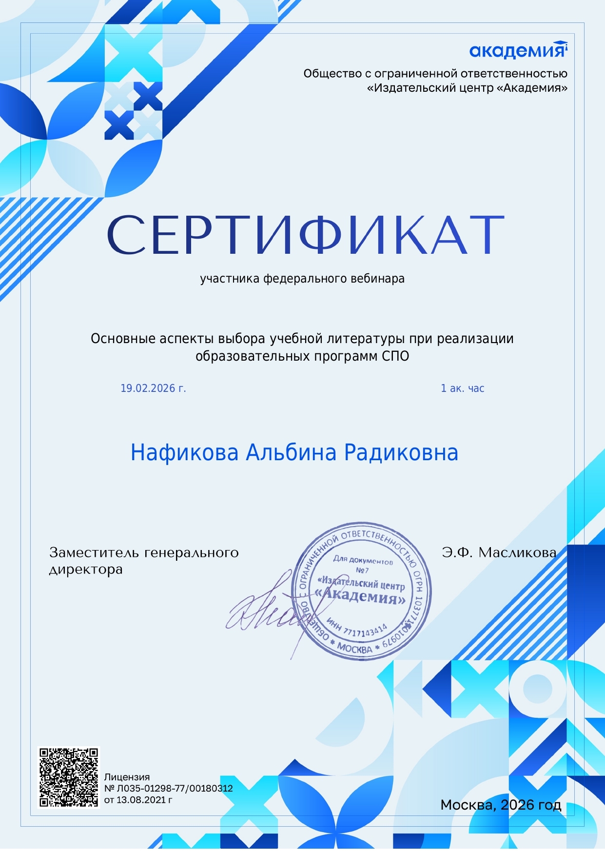 В целях оказания методической поддержки профессиональным образовательным организациям СПО, осуществляющим подготовку специалистов в сфере туризма и гостеприимства, Издательством «Академия» был организован федеральный вебинар "Основные аспекты выбора учебной литературы при реализации образовательных программ СПО", в котором приняли участие сотрудники филиала ГПБОУ УКИПиС в г.Стерлитамак. На нем были рассмотрены ключевые вопросы, касающиеся: